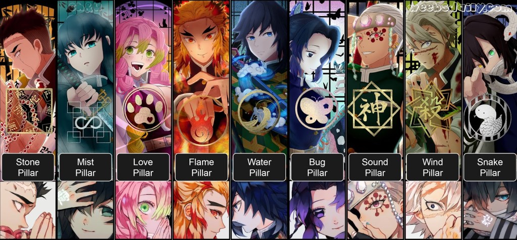 Overtime, Tanjiro meets the Hashira. They are the most elite fighters of the Demon Slayer Corp. I must mention too that they all have fighting styles called “breathing techniques.” Giyu Tomioka is the Water Hashira. Sanemi Shinazugawa is the Wind Hashira. Tengen Uzui is the Sound Hashira. Obanai Iguro is the Snake Hashira. Mitsuri Kanroji is the Love Hashira. Muichiro Tokito is the Mist Hashira. Shinobu Kocho is the Insect Hashira. Kyojuro Rengoku is the Flame Hashira and Gyomei Himejima is the Stone Hashira. Tanjiro uses water and fire breathing. Inosuke uses beast breathing and Zenitsu uses thunder breathing.